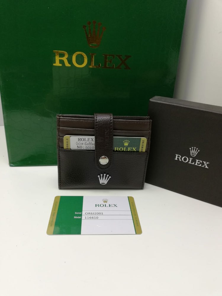 The Rolex card holder is a small wallet designed to hold your cards. The wallet features a stylish design and is stamped with the Rolex Coronet on the front, which adds a touch of elegance. It is made of high-quality materials, ensuring durability and longevity.