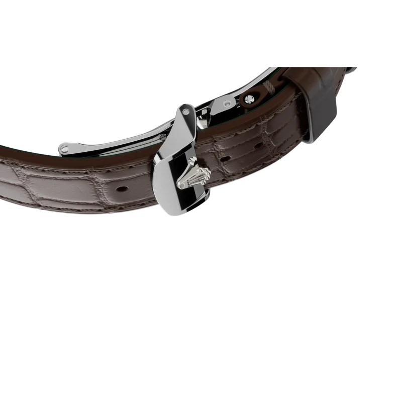 The Alligator Leather Strap fits the Perpetual 1908. This sophisticated strap, available in matt brown or matt black, has tone-on-tone stitching and a green lining that is specially made for the new watch. It has an imitation yellow or white gold Dualclasp, a double folding clasp. The Dualclasp consistently rests in the middle of the wrist thanks to its thoughtfully crafted shape.