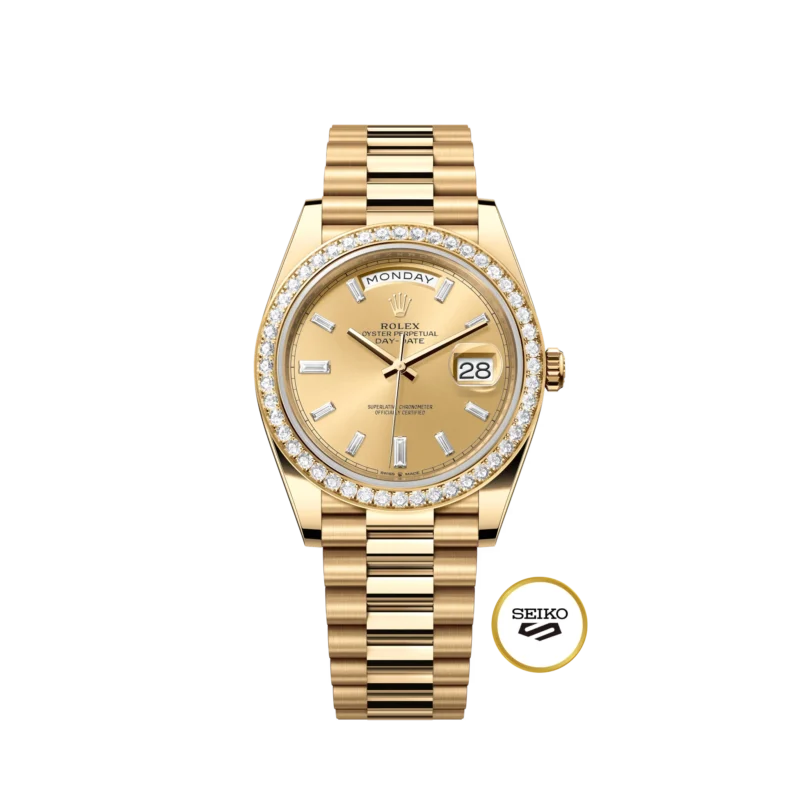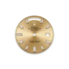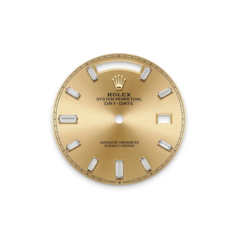 There are ten baguette-cut diamonds on this dial. Numerous dials in the Oyster Perpetual range have beautiful light reflections thanks to the sunray coating. Expert brushing techniques are used to achieve it, resulting in grooves that radiate outward from the dial’s center. Every etching has light that is uniformly diffused, giving the piece a distinctive, delicate glow that changes with wrist position. Following the completion of the sunray finish, electroplating or physical vapor deposition are used to apply the dial color. The dial is finished with a thin layer of varnish.