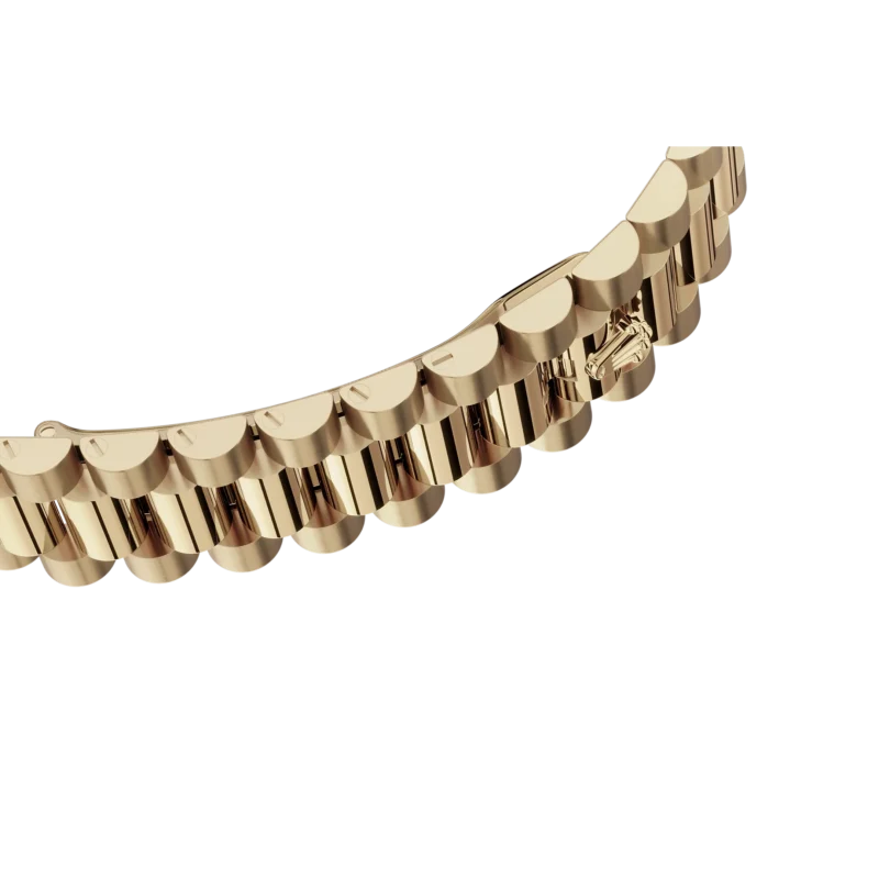 Advanced high technology is used in the creation, development, and manufacturing of Rolex bracelets and clasps, as well as in the rigorous testing that goes into them. Additionally, aesthetic controls by the human eye ensure flawless beauty, just like with all the watch’s components. In 1956, the semi-circular three-piece links of the President bracelet were designed for the debut of the Oyster Perpetual Day-Date. It is always constructed of carefully chosen precious metals and epitomizes comfort and refinement.