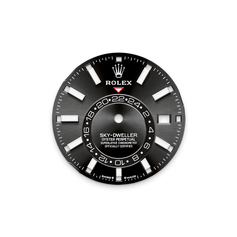 For the white Rolesor version, the Sky-Dweller is attached to a solid-link oyster bracelet made of oyster steel; for the yellow Rolesor version, it is an oyster bracelet made of oyster steel and yellow gold. Benefiting from a novel hidden attachment method under the bezel that guarantees a smooth visible transition between the bracelet and case is the Oyster bracelet. Along with the clever patented Easylink quick extension system, which enables the wearer to effortlessly extend the bracelet length by around 5 mm for added comfort in any situation, it also has a folding oysterclasp.